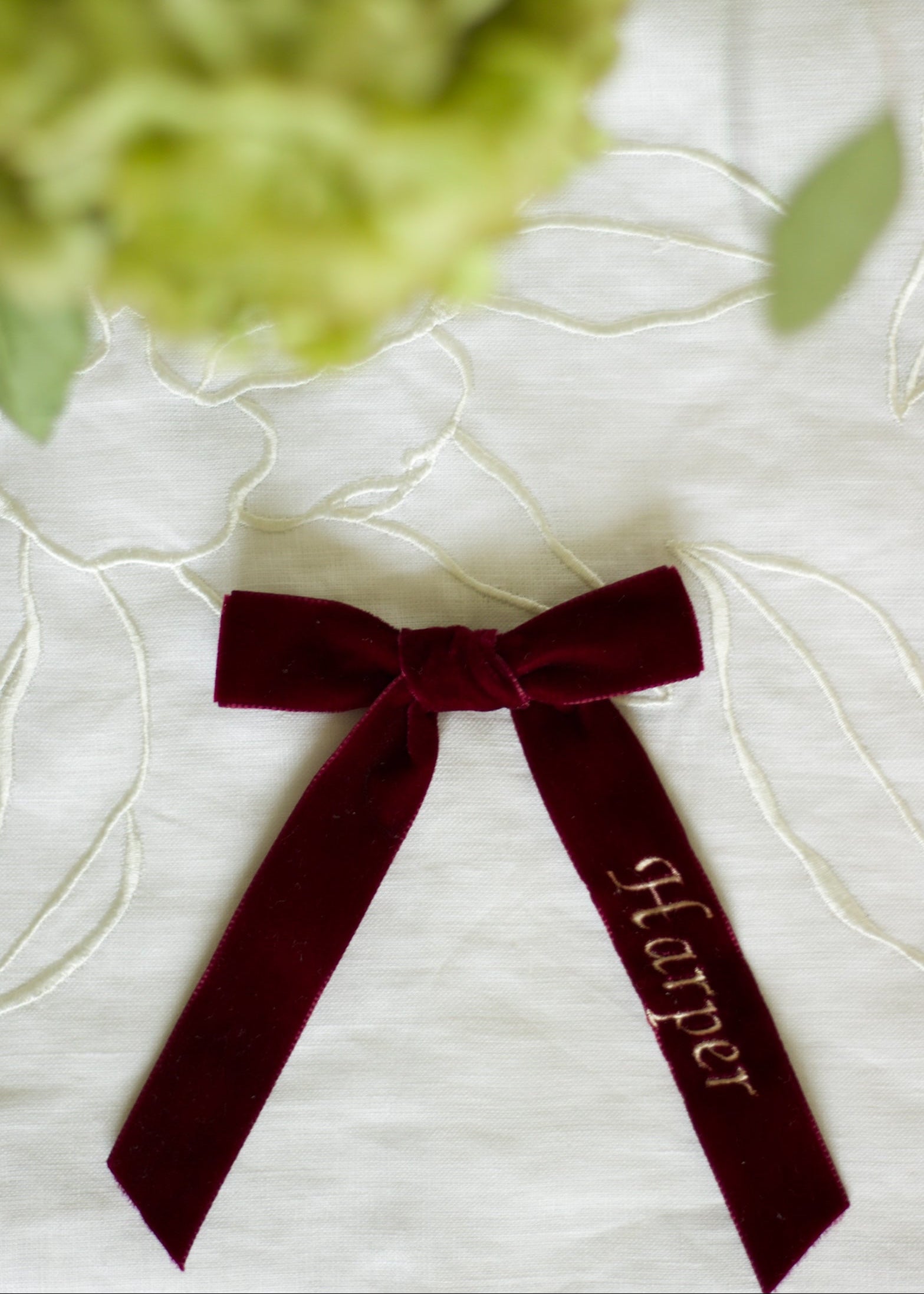 Add a special layer to your place settings with our Monogram Bows. A beautiful velvet ribboned bow embroidered with yours or your guests initials for an elevated place card. They make for a lovely memento at special occasions for guests to take home to remember your special day.