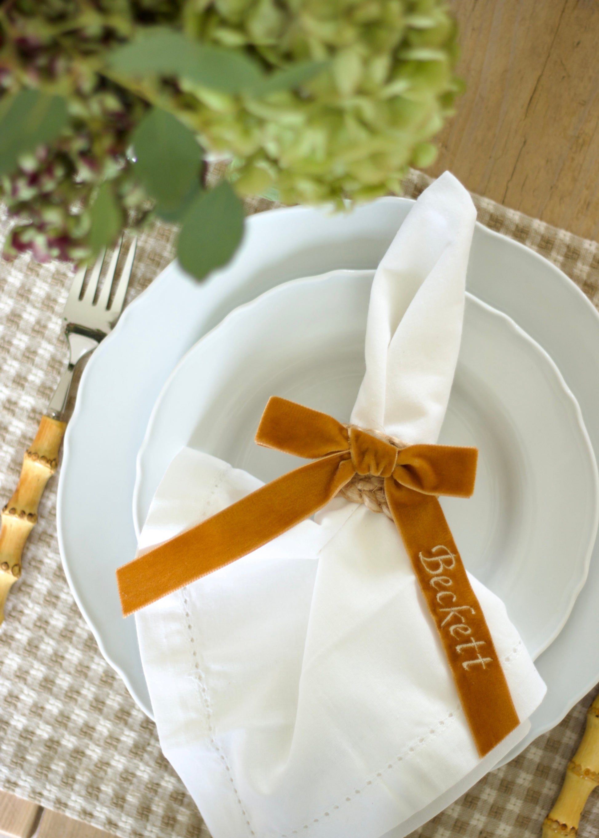 Add a special layer to your place settings with our Monogram Bows. A beautiful velvet ribboned bow embroidered with yours or your guests initials for an elevated place card. They make for a lovely memento at special occasions for guests to take home to remember your special day.